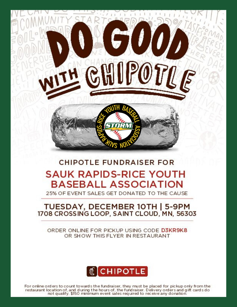 Supporting SRYBA is as easy as grabbing some food for dinner tonight at THIS Chipotle location: 1708 Crossing Loop, Saint Cloud! Place an order any time 5:00-9:00 PM today, 12/10.
