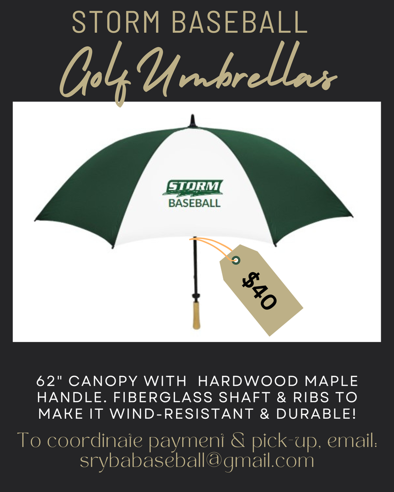 We have a limited number of Storm Baseball umbrellas available for purchase. We had these available at our 1st Annual Golf Tournament and are excited to open the sale to our baseball community. They are BIG, great QUALITY, and are perfect for both rainy and hot, sunny summer days.